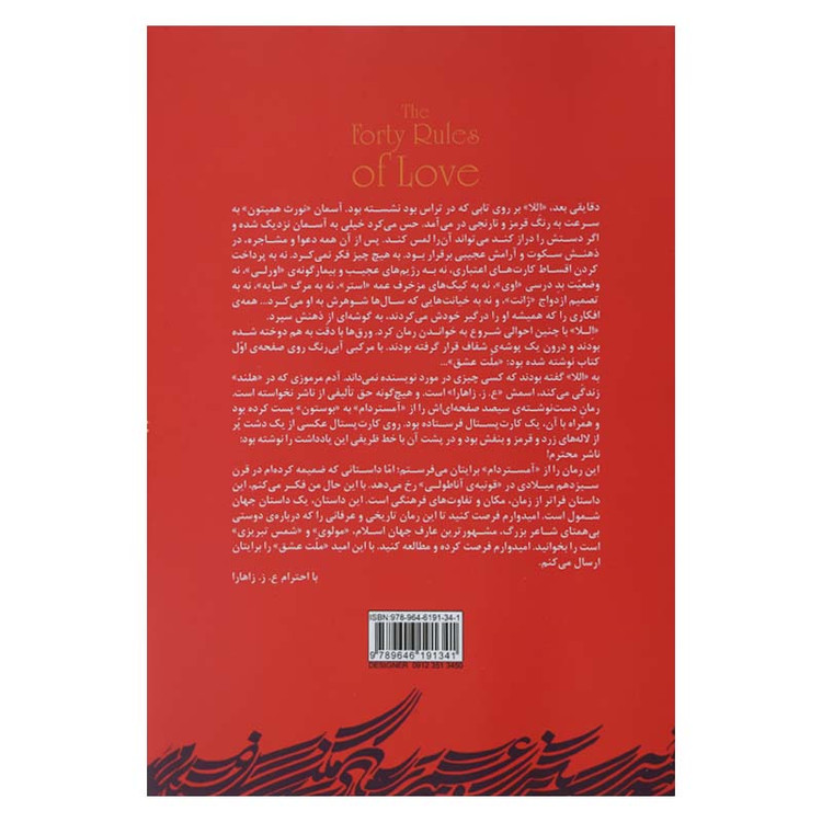 در این کتاب، چهل قاعدهی عشق از زبان شمس روایت میشود که هرکدام دریچهای به سوی معرفتی عمیق باز میکنند. کمکم این قوانین در زندگی شخصیت اول داستان، اللا، معنی و کاربرد پیدا میکنند و دیگر او میتواند عشق را نه فقط در داستان مولانا و شمس بلکه در همین دنیا و از طریقی دیگر بجوید و با آن زندگی کند. این کتاب راهنمای عملی رسیدن به زندگی عاشقانه است؛ البته عشقی که رنگ و بوی «عارفانه» دارد. و این نکتهای است که این کتاب را از کتابهای عاشقانهی مشابه خودش متمایز میکند.