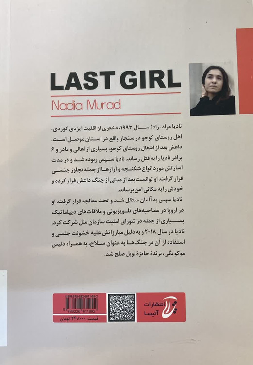 کتاب آخرین دختر، اثری نوشته ی نادیا مراد است که اولین بار در سال 2017 انتشار یافت. در پانزدهم آگوست سال 2014، زندگی نادیای بیست و یک ساله برای همیشه تغییر کرد. نیروهای داعش، مردم روستای محل زندگی نادیا را به خاک و خون کشیدند: مردان اعدام شدند و زنان را به عنوان برده های جنسی به اسارت گرفتند. شش برادر نادیا و اندکی بعد، مادرش نیز کشته شدند و اجسادشان، در گورهایی دسته جمعی انداخته شد. نادیا به موصل آورده شد و به همراه هزاران دختر ایزدی، در تجارت برده فروشی داعش قرار گرفت. نادیا و سایر دختران، در این جهنم روی زمین، هر روز مورد تجاوز و ضرب و شتم قرار می گرفتند. نادیا درنهایت موفق شد که از دست اسیرکنندگان خود بگریزد و به خانه ی خانواده ای مسلمان پناه آورد. فرزند ارشد این خانواده، جان خود را به خطر انداخت تا نادیا را به شکلی مخفیانه به جایی امن برساند.